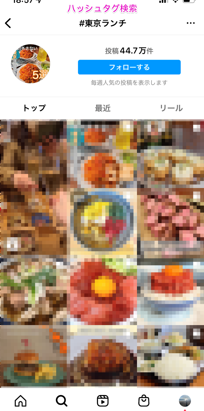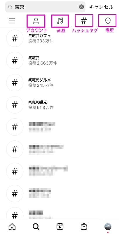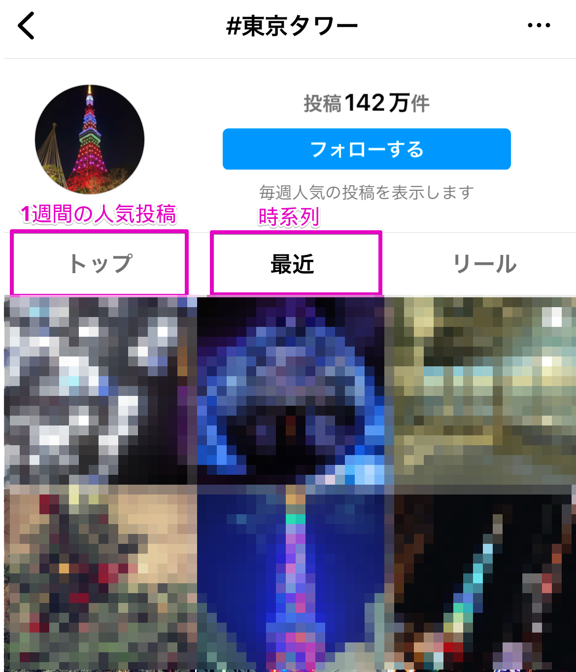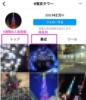 例えば、ハッシュタグ検索の場合「トップ」の検索結果には直近1週間の人気の投稿が表示される仕組みになっており、「最近」のタブではハッシュタグのついた投稿が時系列で表示されます。
