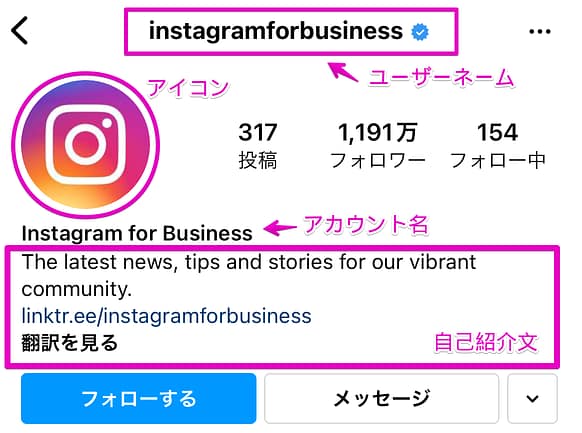 前述した通り、Instagramの検索機能ではユーザーが使用した検索ワードが最重要視されるため、アカウント名やユーザーネームはユーザーが検索ワードとして使用する可能性の高いシンプルなものにしましょう。