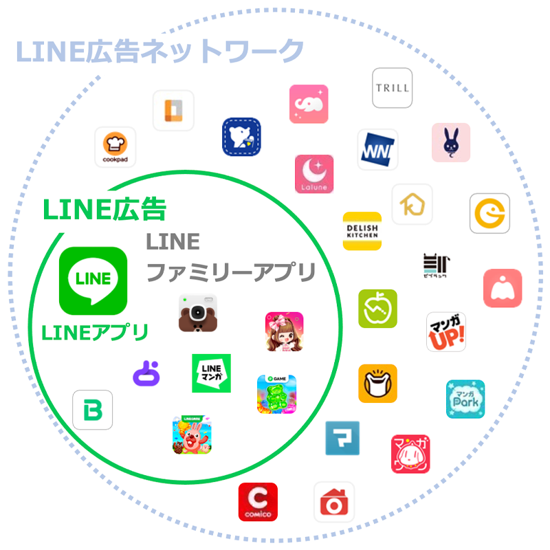 LINE広告ネットワークではゲーム、ニュース、漫画アプリなど、10,000以上ものアプリのユーザーへ配信が可能であり、幅広い層へアプローチができます。