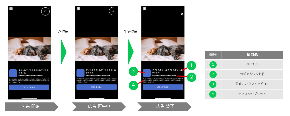 静止画フォーマットは15秒間広告が表示され、その間は時間がカウントダウン形式で表示されます。