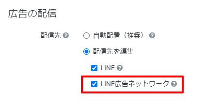 ②広告グループの「広告の配信」から配信先を「配信先を編集」を選択し「LINE広告ネットワーク」を選択する場合