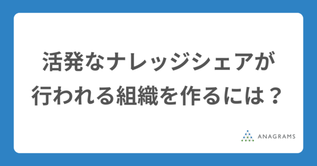 <blockquote class="wp-embedded-content" data-secret="X5qtBsueMB"><a href="https://anagrams.jp/blog/how-to-build-knowledge-sharing-culture/">活発なナレッジシェアが行われる組織を作るには?</a></blockquote><iframe sandbox="allow-scripts" security="restricted" src="https://anagrams.jp/blog/how-to-build-knowledge-sharing-culture/embed/#?secret=X5qtBsueMB" width="600" height="400" title="“活発なナレッジシェアが行われる組織を作るには?” — アナグラム株式会社" data-secret="X5qtBsueMB" frameborder="0" marginwidth="0" marginheight="0" scrolling="no" class="wp-embedded-content"></iframe><script type="text/javascript"> /* <![CDATA[ */ /*! This file is auto-generated */ !function(d,l){"use strict";l.querySelector&&d.addEventListener&&"undefined"!=typeof URL&&(d.wp=d.wp||{},d.wp.receiveEmbedMessage||(d.wp.receiveEmbedMessage=function(e){var t=e.data;if((t||t.secret||t.message||t.value)&&!/[^a-zA-Z0-9]/.test(t.secret)){for(var s,r,n,a=l.querySelectorAll('iframe[data-secret="'+t.secret+'"]'),o=l.querySelectorAll('blockquote[data-secret="'+t.secret+'"]'),c=new RegExp("^https?:$","i"),i=0;i<o.length;i++)o[i].style.display="none";for(i=0;i<a.length;i++)s=a[i],e.source===s.contentWindow&&(s.removeAttribute("style"),"height"===t.message?(1e3<(r=parseInt(t.value,10))?r=1e3:~~r<200&&(r=200),s.height=r):"link"===t.message&&(r=new URL(s.getAttribute("src")),n=new URL(t.value),c.test(n.protocol))&&n.host===r.host&&l.activeElement===s&&(d.top.location.href=t.value))}},d.addEventListener("message",d.wp.receiveEmbedMessage,!1),l.addEventListener("DOMContentLoaded",function(){for(var e,t,s=l.querySelectorAll("iframe.wp-embedded-content"),r=0;r<s.length;r++)(t=(e=s[r]).getAttribute("data-secret"))||(t=Math.random().toString(36).substring(2,12),e.src+="#?secret="+t,e.setAttribute("data-secret",t)),e.contentWindow.postMessage({message:"ready",secret:t},"*")},!1)))}(window,document); /* ]]> */ </script>