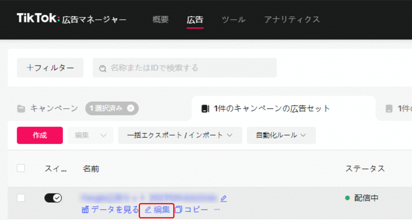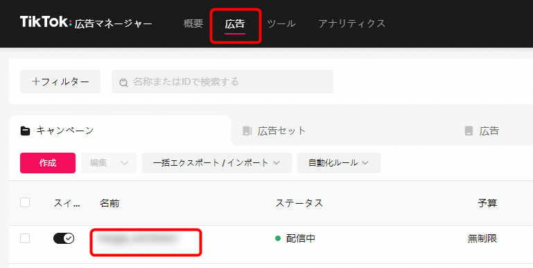 ここからは、実際にTikTok広告の管理画面よりPangleの配信先を確認する手順を紹介します。