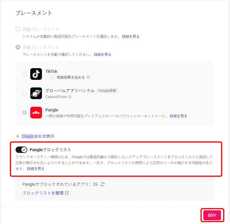 「Pangleブロックリスト」のスライダーをオンにし、「保存」をクリックします。これで該当の広告セットでの配信において、ブロックリストに登録した配信先を除外することができます。