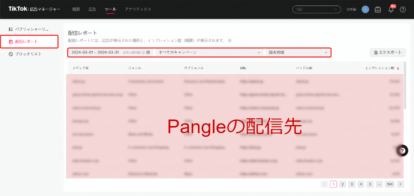 また、Pangleの配信先は「エクスポート」ボタンをクリックで、CSVファイルでの出力も可能です。配信レポート上だと1ページに20件しか表示されないため、Excelなどを使用して集計したい場合はエクスポートがおすすめです。