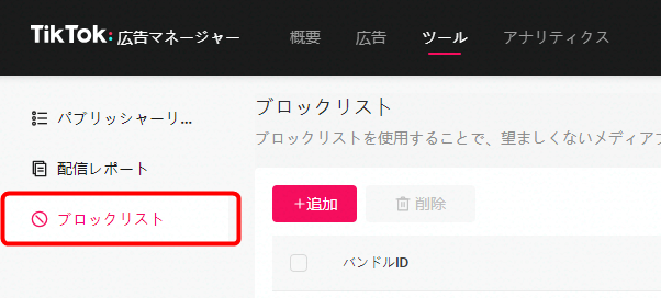 Pangleブランドセーフティの画面を開き、左側のメニューから「ブロックリスト」をクリックします。