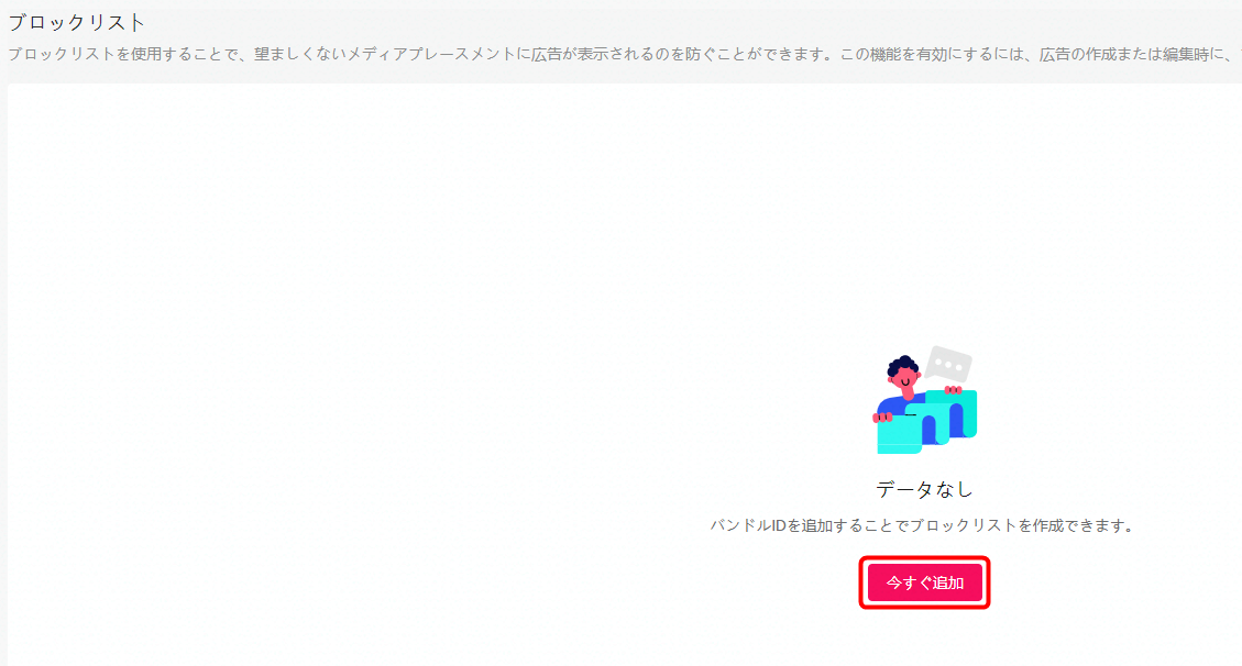ブロックリスト画面中央の「今すぐ追加」をクリックします。