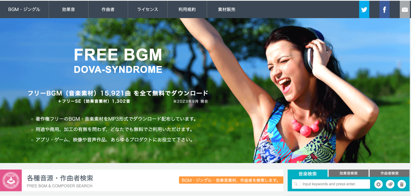 DOVA-SYNDROMEは、著作権フリーのBGM、効果音が提供されている素材サイトです。多くの作曲家が登録し、楽曲数は1万5000曲以上登録されています。