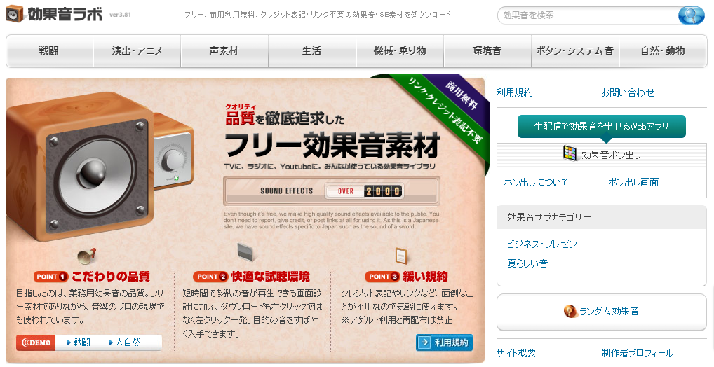 効果音ラボは、効果音制作専門の個人事業主の方が運営している素材サイトです。ほぼすべての素材を管理者の方が作成・録音しているためクオリティが一定で、動画だけでなくテレビ番組やCM、ゲームでも使用されています。