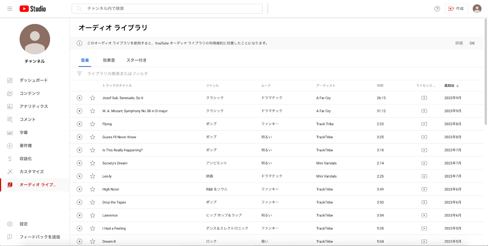 YouTube Audio Libraryは、YouTubeが公式に提供しているBGMや効果音の素材サイトです。閲覧するには、YouTube Studioにログインする必要があります。