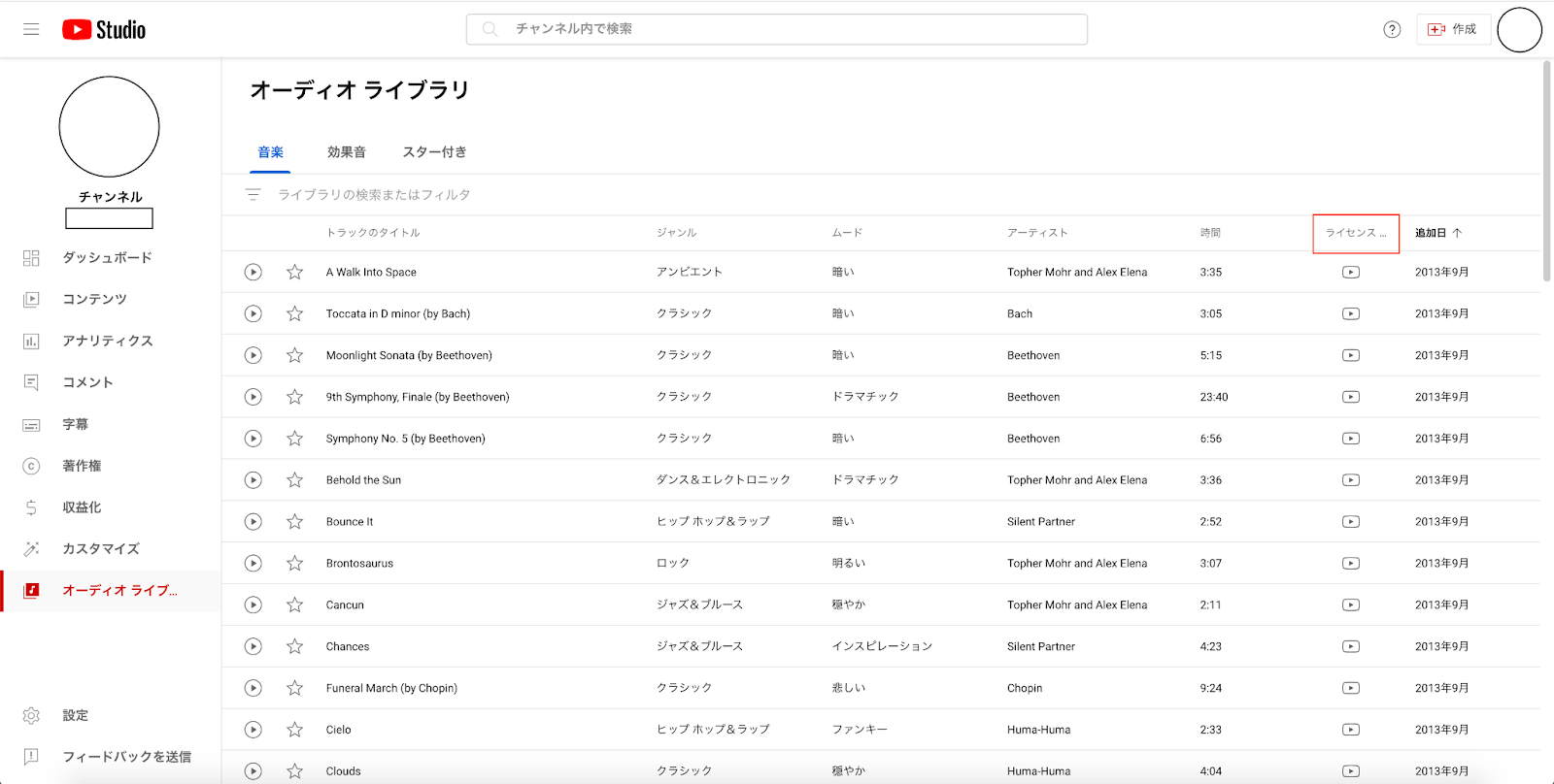 YouTube Audio Libraryのライセンスタイプの項目より帰属表示の確認ができます。