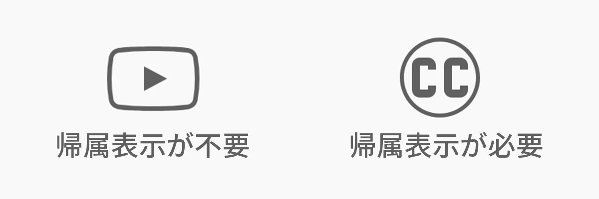 ライセンスタイプの表示は2種類あり、YouTubeのアイコンマークが表示されている曲は帰属表示の必要がなく、CCマークの曲は帰属表示が必要です。