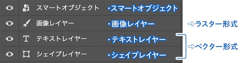 「スマートオブジェクト」の説明に入る前に、Photoshopの代表的なレイヤー4種類を解説します。