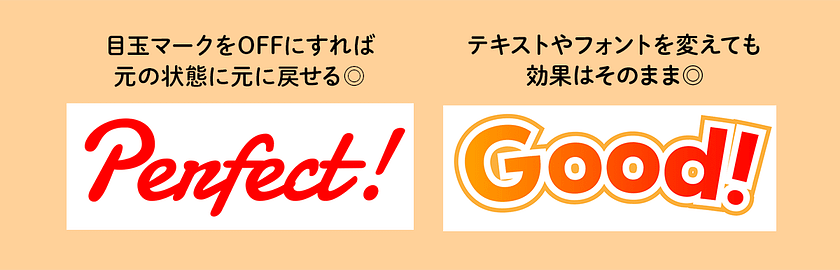 オブジェクトに付与したエフェクトは、アピアランスパネルを開けば再調整することができます。目のマークをOFFにすれば元の状態に戻すことができますし、効果はそのままでテキストやフォントを変えることも可能です。また、アピアランス属性はスポイトを使って、別のテキストやオブジェクトにも簡単にコピーすることができます。