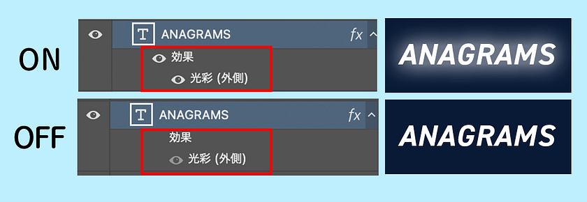 レイヤースタイルやスマートフィルターに共通する便利な機能として、option(alt)を押しながら別のレイヤーにドラッグ&ドロップすると、簡単にエフェクトをコピーすることができます。また左側の目のマークを押すと効果の表示・非表示を切り替えられるため、簡単に初期状態に戻しやすいです。