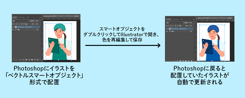 またAIやSVG形式などのベクターデータは、Photoshop上にスマートオブジェクトとして配置することができます。Illustratorと連携させることができ、後々の修正や更新が楽になります。