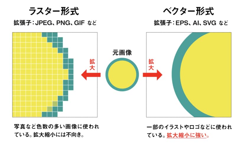 テキストレイヤーとシェイプレイヤーはベクター形式、画像レイヤーはラスター形式ですが、ラスター形式の場合、画像の拡大・縮小を繰り返すと画質が劣化してしまいます。(ラスターとベクターの違いについては、以下の図をご覧ください)