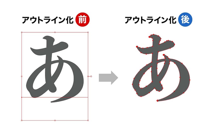 Illustratorの場合は、テキストの編集機能を保持したままデータを保存すると、別のPCで開いて対象フォントを持っていなかった場合に、自動的に別のフォントに置き換わってしまいます。この現象はフォントをアウトライン化することで防ぐことができますが、一方でテキストの再編集はできなってしまうのがデメリットです。再編集することを前提としている場合は、Photoshopと同様になるべく互換性の高いフォントを使った方が良いでしょう。