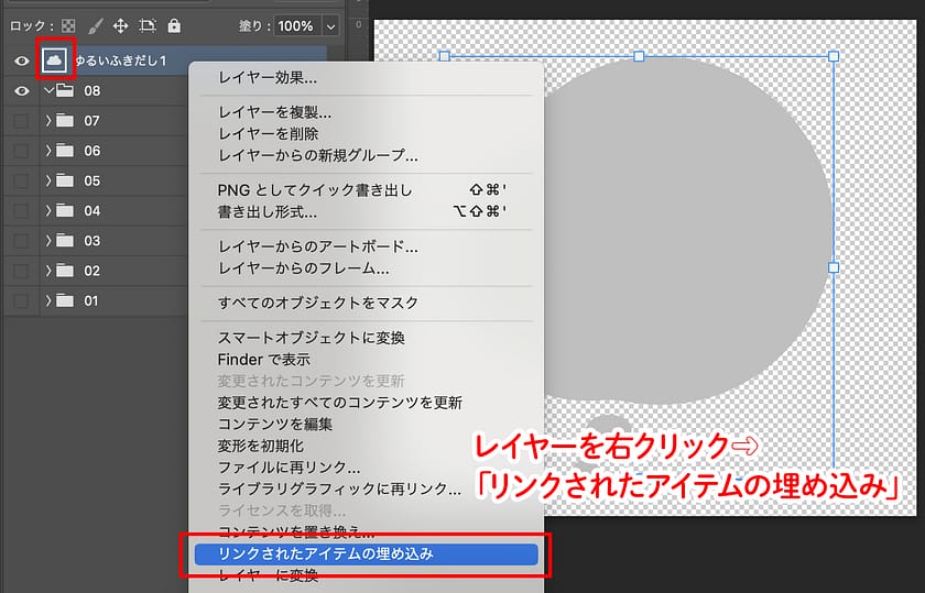 CCライブラリの素材を使うと、レイヤーに雲のマークが表示されます。これはCCライブラリとリンク状態であることを意味していますが、このままデータを共有すると相手が同じCCライブラリを使っていない限りは、 素材が正しく表示されない可能性があります。 保存する前に必ず埋め込みをしておきましょう。