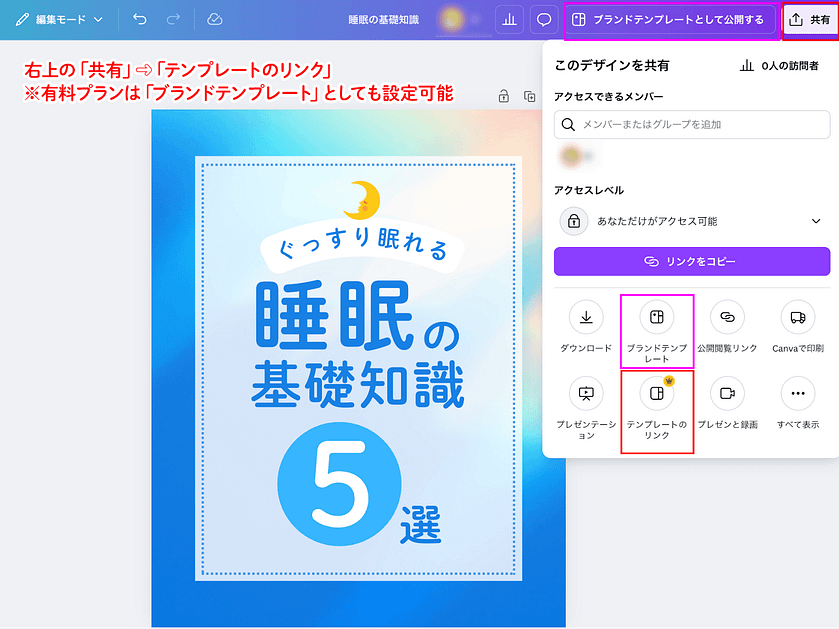 ProまたはTeamsのプランでは、「ブランドテンプレート」としても保存することができます。通常のテンプレート保存との違いは、閲覧や編集の権限を設定できることです。