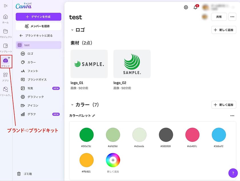 ブランドキットはロゴやフォント、カラーなどを登録できる機能です。作成したブランドキットはチーム内で共有することができるため、ブランドガイドラインなどに沿って登録しておくと、同じ企業のデザインを作る際に役立ちます。