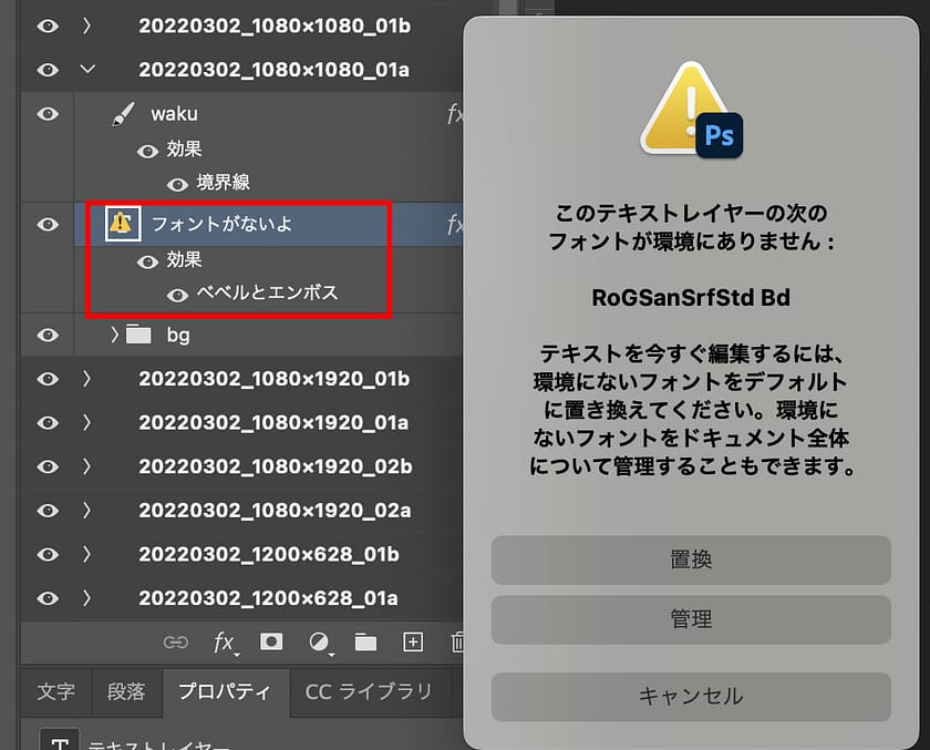 Photoshopのデータ内で使用されているフォントを持っていないと、テキストレイヤーに「!」マークが表示されます。テキストの編集機能は残っていますが、同じフォントを持っていない場合はテキストレイヤーをラスタライズ(再編集不可の画像レイヤー化)するか、別のフォントに置換して編集機能を復活させる必要があります。