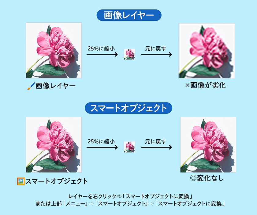 そこで活用したいのがスマートオブジェクトです。画像レイヤーをスマートオブジェクトに変換すると、拡大・縮小しても画質が劣化しなくなります。