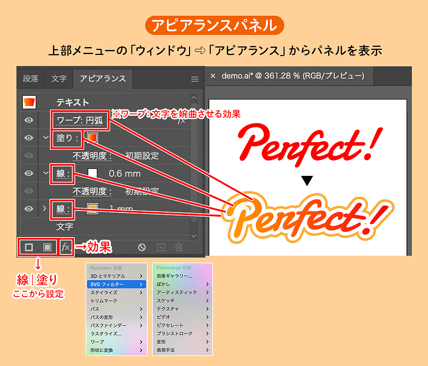 アピアランスを使うと、テキストやシェイプの編集機能を保持しながら、境界線やドロップシャドウなど、さまざまなエフェクトをつけることができます。