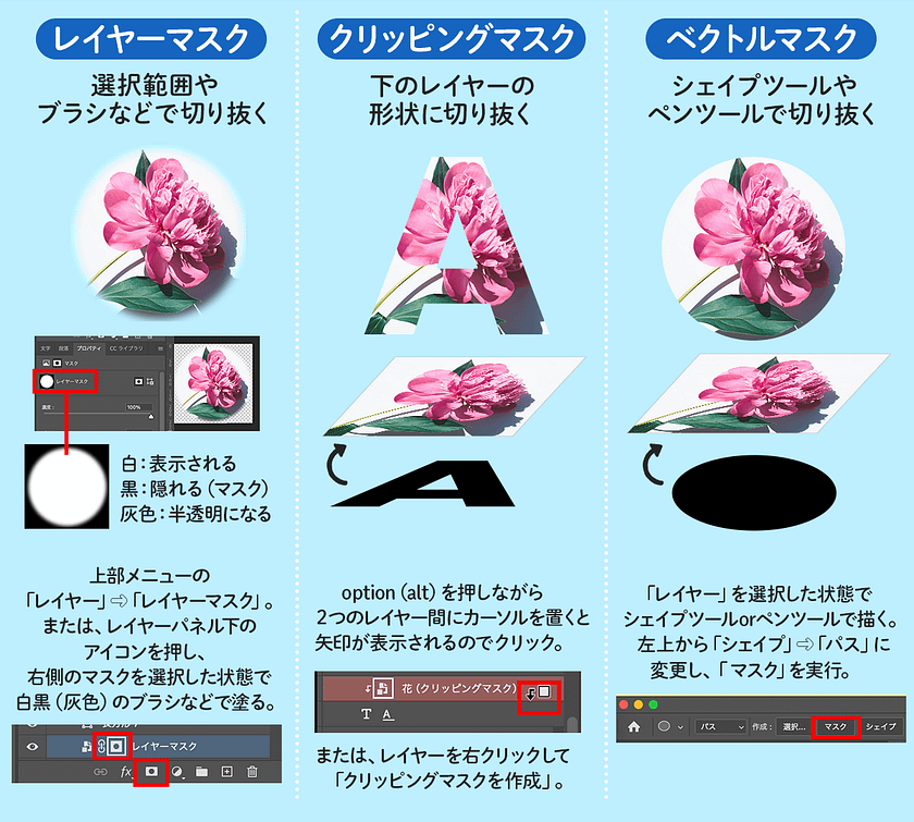 Photoshopには以下3つのマスク機能があります。