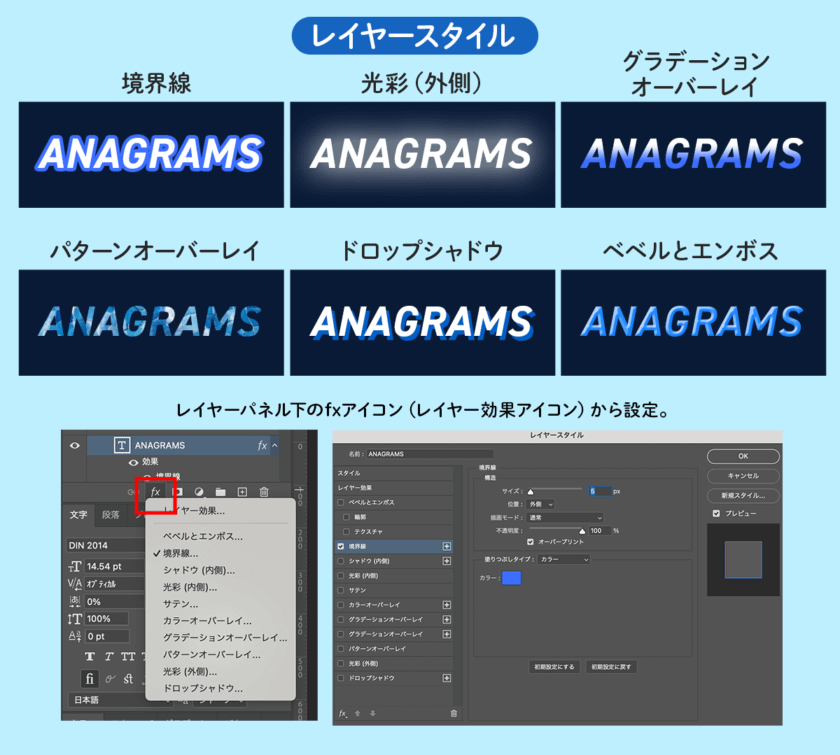 レイヤーやフォルダに対して、エフェクトや装飾をかけることができます。テキストに袋文字や光彩などをつけたいときに便利です。