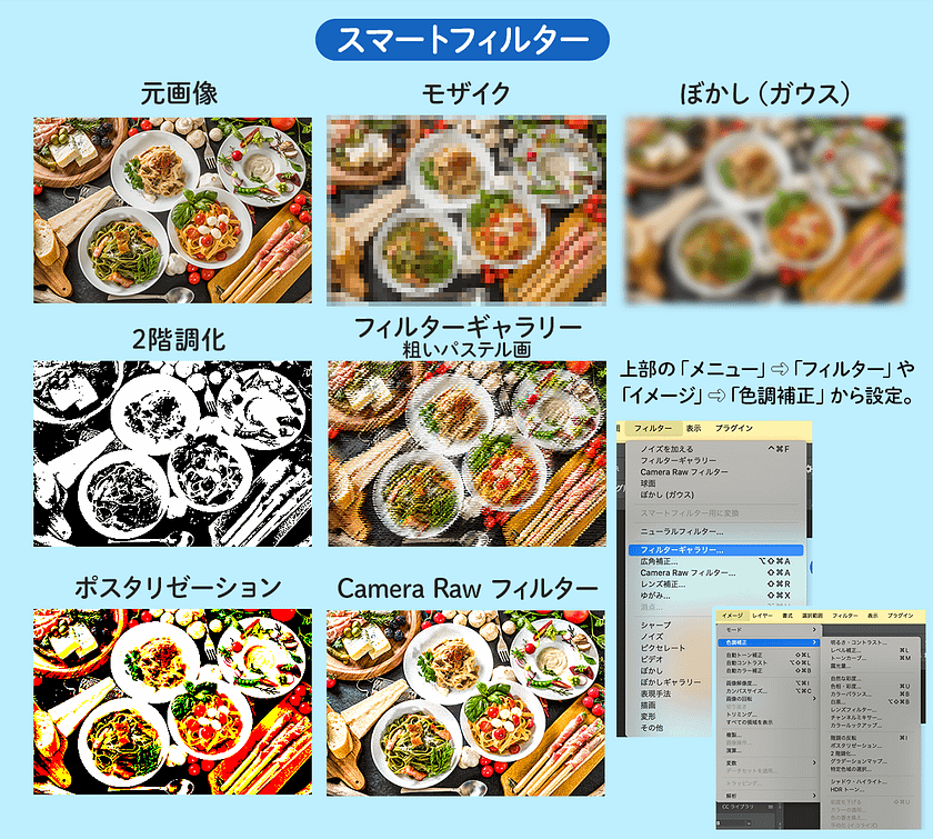さらに、スマートオブジェクトレイヤーに対しては「スマートフィルター」という形でさまざまなエフェクトをかけることができます。