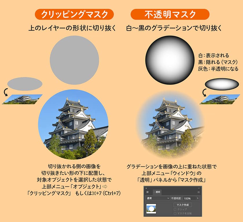 Illustratorにもマスク機能が備わっています。IllustratorのクリッピングマスクはPhotoshopと反対で、上のレイヤーの形に下のレイヤーがくり抜かれます。