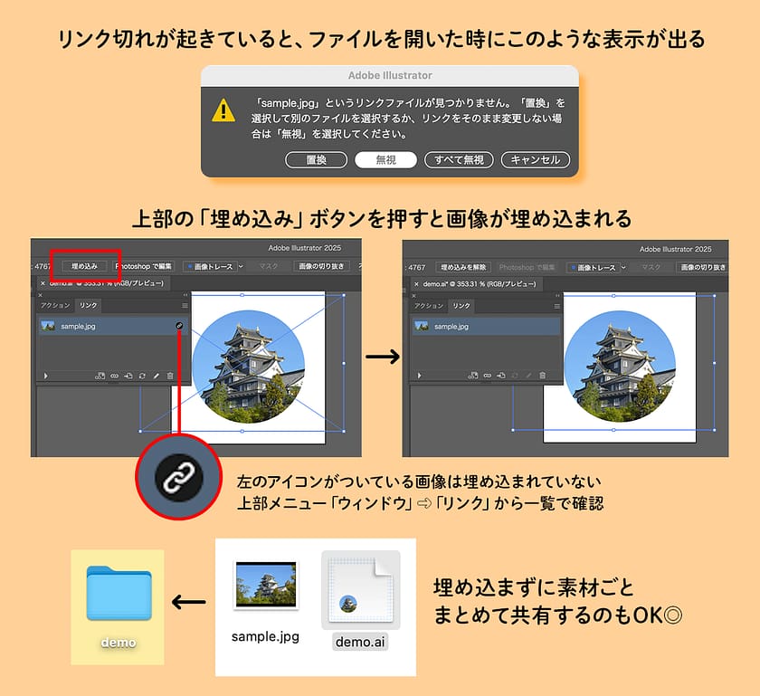 画像の埋め込み忘れにより、配置していた画像が表示されなくなってしまう現象は、Illustratorでよくあるトラブルの一つです。しかしながら、画像の点数が多いときはすべて埋め込んだ状態で共有するとデータが重くなってしまいます。そのようなケースでは、リンク画像とデータをセットにして、フォルダごと管理・共有する方法がおすすめです。