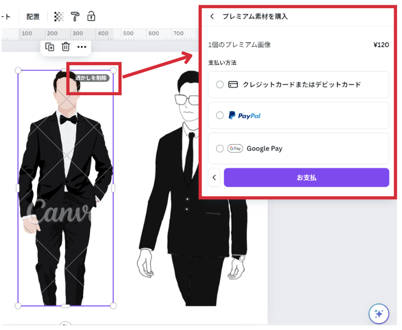 有料の素材を利用するには有料プランに登録、あるいは無料プランでも有料素材の右上にある「透かしを削除」を選択し、1点120円からの購入も可能です。