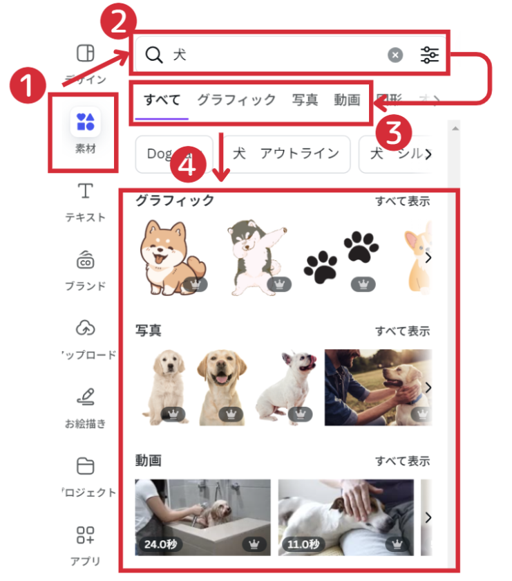 左のバーの「素材」から検索窓でキーワードを入力し検索します。