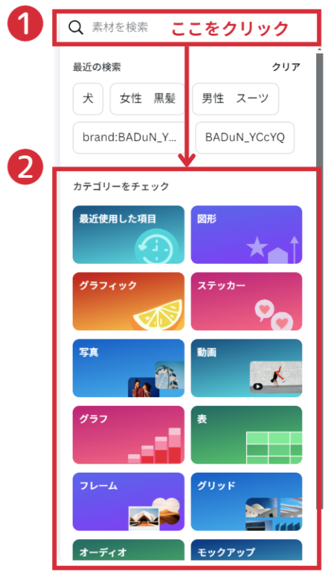 すでに探したい素材の種類が決まっている場合は、検索窓をクリックするとカテゴリーが選べるので、選択の上で検索もできます。