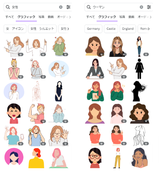例えば、「女性の素材がほしい」と考えたとき「女性」で検索するものの、イメージにぴったりなものがなければ、「ウーマン」「Women」など検索するワードをカタカナや英語も交えてみましょう。同じ意味の言葉であっても、検索時に使用するワードが変わると検索結果に違いがでます。Canvaは日本語で検索したキーワードを、英語に翻訳して検索結果が表示されているため、英語で検索したときにしか出てこない素材もあります。