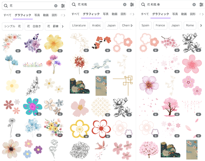 例えば、日本らしい花の素材を探す中で、「花」単体で検索するよりも、「花 和風」「花 和風 春」など入れてみるとイメージしている素材が見つかりやすくなります。