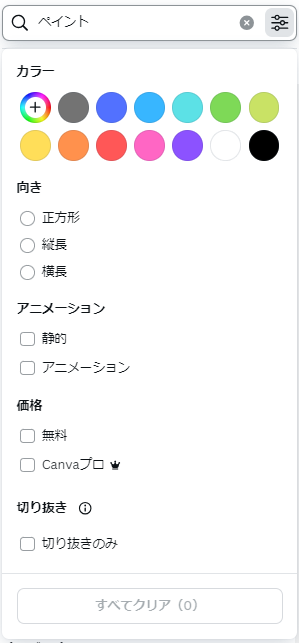 素材の色を指定したいときは、検索窓の絞り込み条件から選択できます。