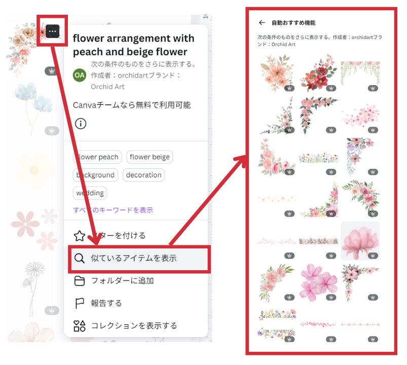「似ているアイテムを表示」は、特定のアイテムを選択した際に、そのアイテムに似た他の素材を表示してくれる機能です。この機能を活用することで、イメージにぴったりの素材を簡単に見つけることができます。