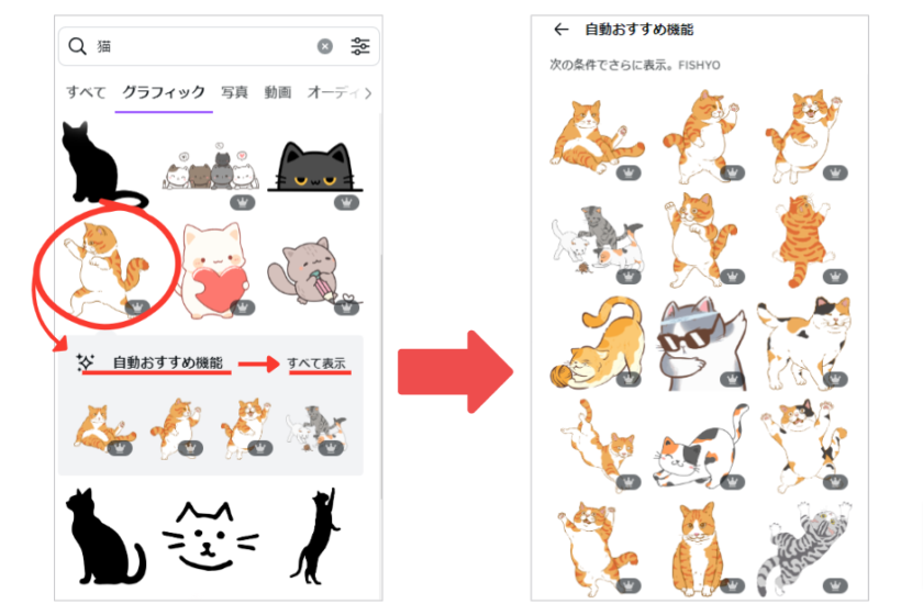 「自動おすすめ機能」は、ユーザーのデザイン傾向に基づいて素材を提案してくれる機能です。この機能を利用することで、検索ではたどり着けなかった素材に出会うことができます。