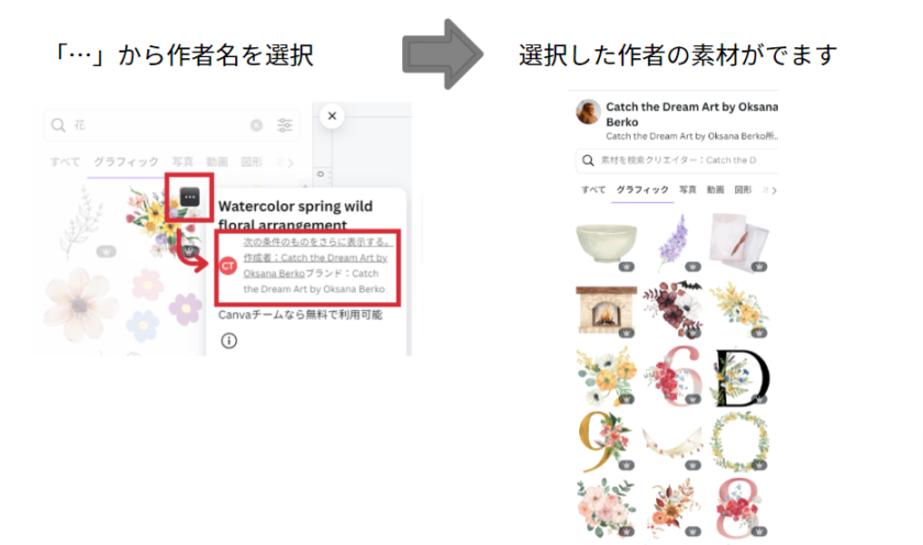 素材にカーソルを合わせると右上角に黒いアイコンが出ます。ここをクリックすると、作者名がでてくるのでクリックすると、同じ作者の別の素材を見ることができます。