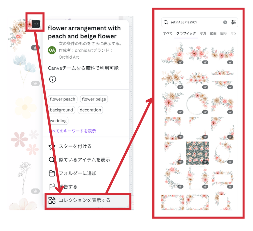 「コレクションを表示する」は、クリエイターが似たような配色やデザインのものを複数まとめてセットとして登録しているものです。コレクションの素材を使うことで、より統一感のあるデザインを演出できます。なお、「コレクションを表示する」はすべての素材にあるわけではなく、一部の素材で提供されているものです。