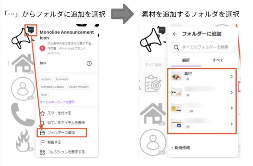 フォルダに素材を追加するには、素材の右上の「…」からフォルダに追加を選択します。保存先のフォルダを選択します。