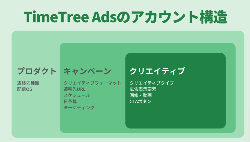 TimeTree広告は上から「プロダクト」「キャンペーン」「クリエイティブ」の3つの階層から構成されています。