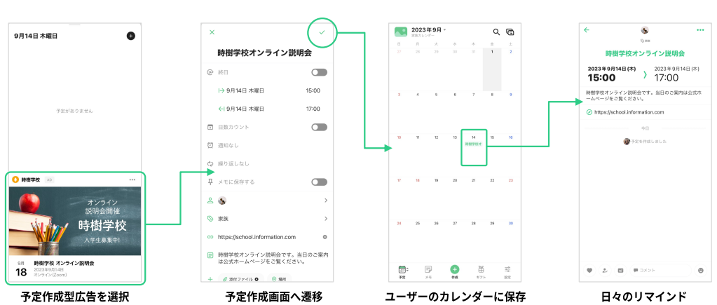 TimeTree広告独自の遷移先の種類である「イベント」は、広告をクリック後に通常LPではなくTimeTreeの予定作成画面が開き、そのままユーザーのカレンダーに予定として登録してもらうことができる配信方法です。
