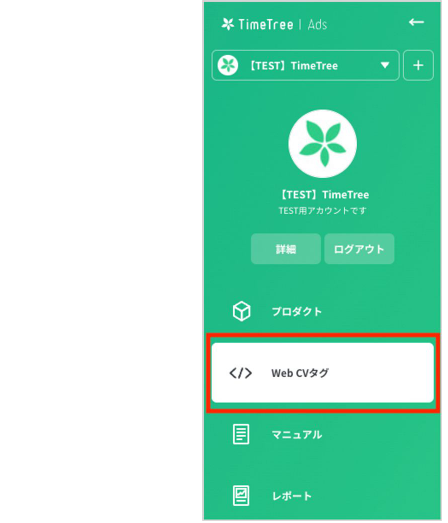 ①広告管理画面の「Web CVタグ」をクリックし、タグの発行ページに移動します。