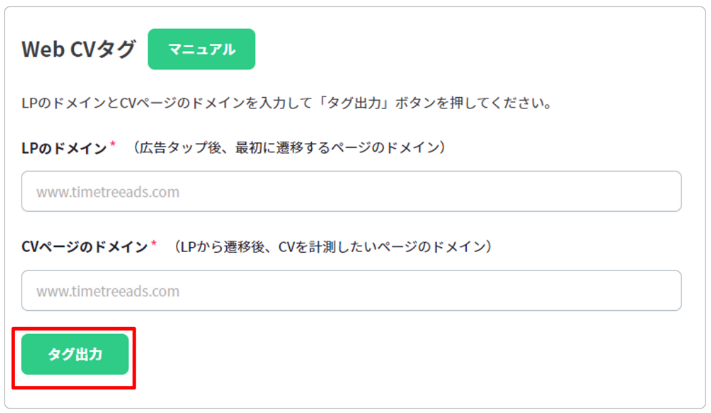 ②「LPのドメイン」と「CVページのドメイン」それぞれに該当のドメインを入力し、「タグ出力」ボタンをクリックします。計測したいCVが複数ある場合は、「Web CVタグ」の発行の手順を複数回行ってください。
