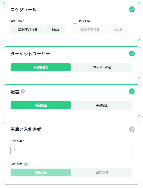 | 入札方式 | 固定CPM | 2024年4月、自動入札は提供を停止しております。固定CPMのみ選択が可能です。 |