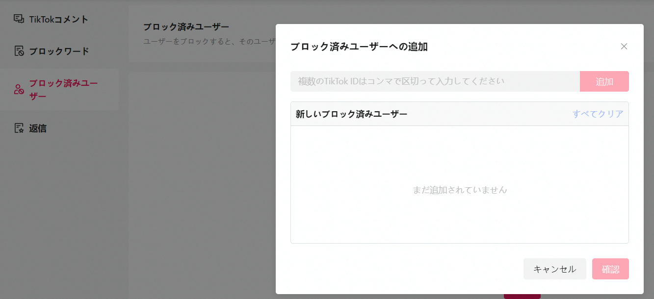 また、左側の「ブロック済みユーザー」のセクションから「追加」をクリックし、TikTok IDを打ち込んでユーザーをブロックすることも可能です。